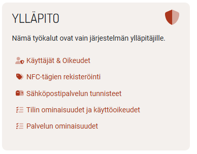 Jos haluat lisää käyttöoikeuksilla rajattuja paikkoja tai muuta käyttäjähallintaan liittyen, olethan yhteydessä asiakaspalveluumme. Järjestelmää kehitetään aktiivisesti käyttäjän tarpeisiin ja toiveisiin mukautuen.