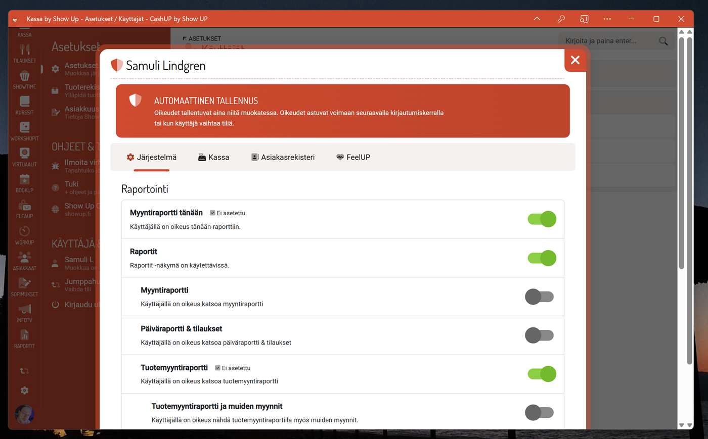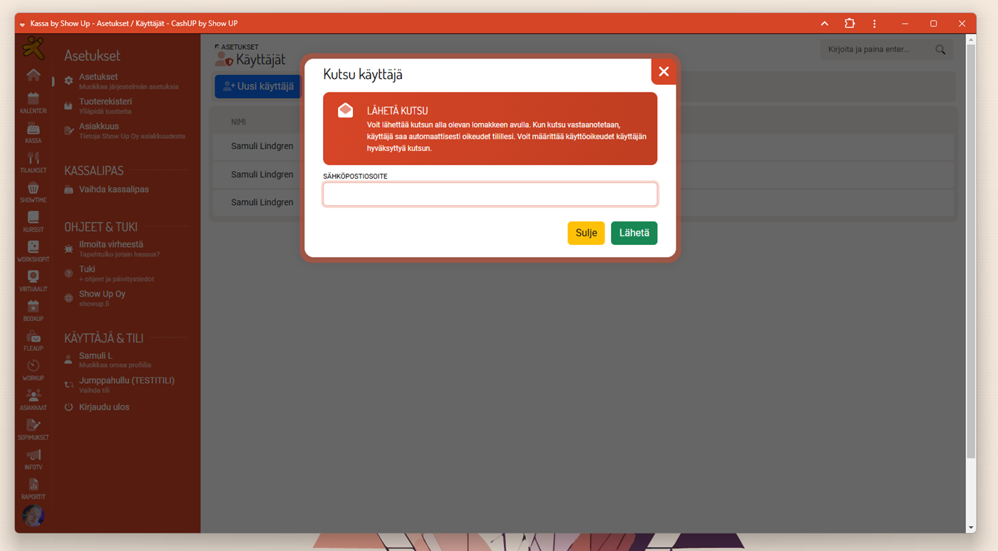 Voit muokata käyttäjän oikeuksia, kun hän on hyväksynyt kutsun. CashUP -järjestelmä ei rajoita käyttäjien määrää.