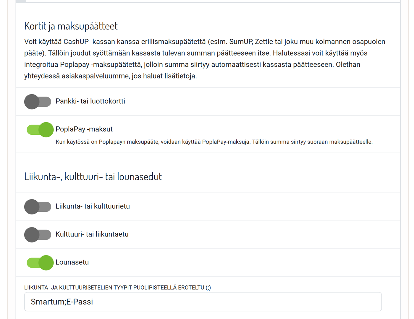 Näiden asetuksien avulla tuot näkvyiin ne maksutavat, joita haluat näyttää kassaa käyttäessä. Huomaathan, että verkkokaupan maksutapoja ylläpidetään verkkokaupan asetuksien kautta.