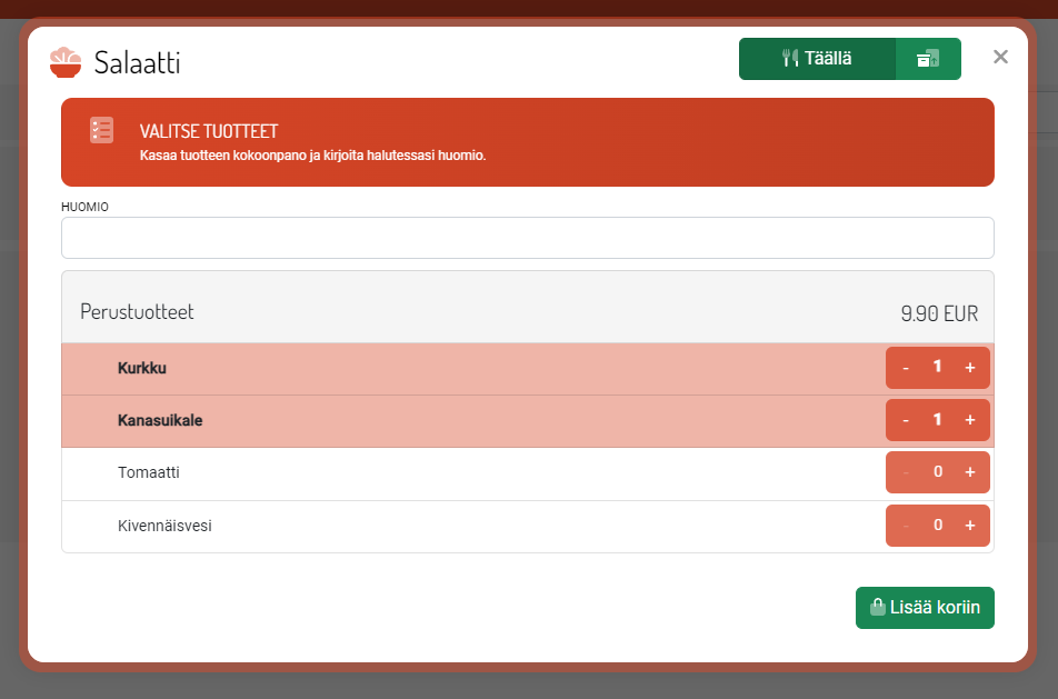 Säädettävät perus- ja lisätuotteet ja niiden tulostuminen bong-lapuksi keittiöön auttavat sujuvoittamaan kassatyöskentelyä.