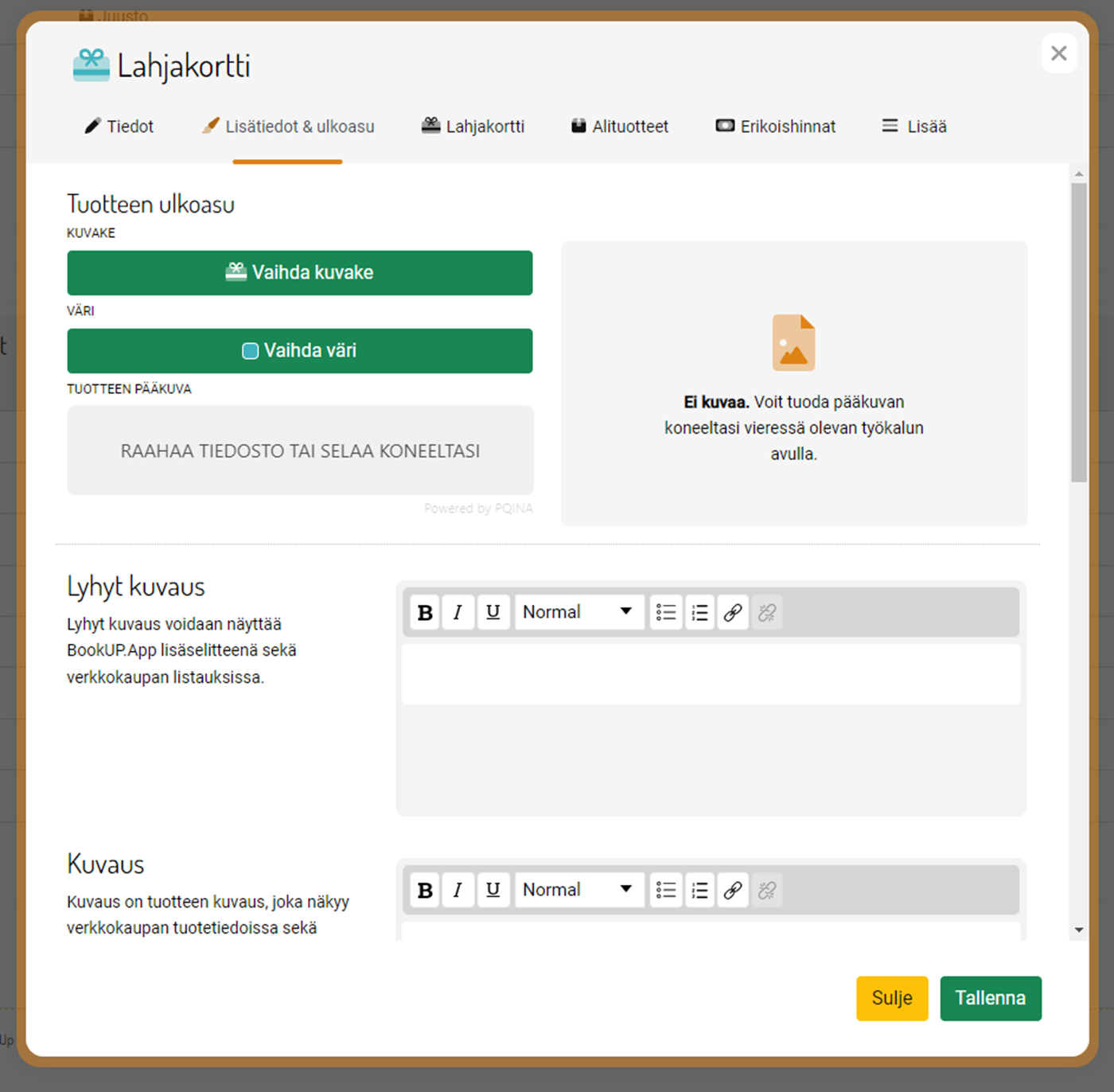 Voit muokata tuotteen ulkoasua kassassa sekä verkkokaupassa tämän välilehden asioilla. Kuvake, väri sekä kuva muokkaa suoraan tuotelistaa kassassa. Sen lisäksi verkkokauppaan ja BookUP.Appin palvelulistaukseen vaikuttavat Lyhyt kuvaus ja kuvaus. Ohje mahdollistaa esimerkiksi valmistusohjeen näyttämisen kassaa käyttävälle henkilölle.