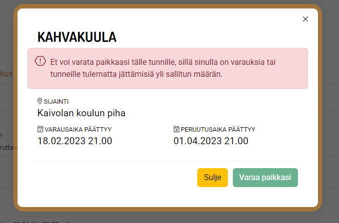 - Kun varausmaksimi ylittyy, asiakas ei voi enää varata uusia tunteja tai kuntosalivarauksia