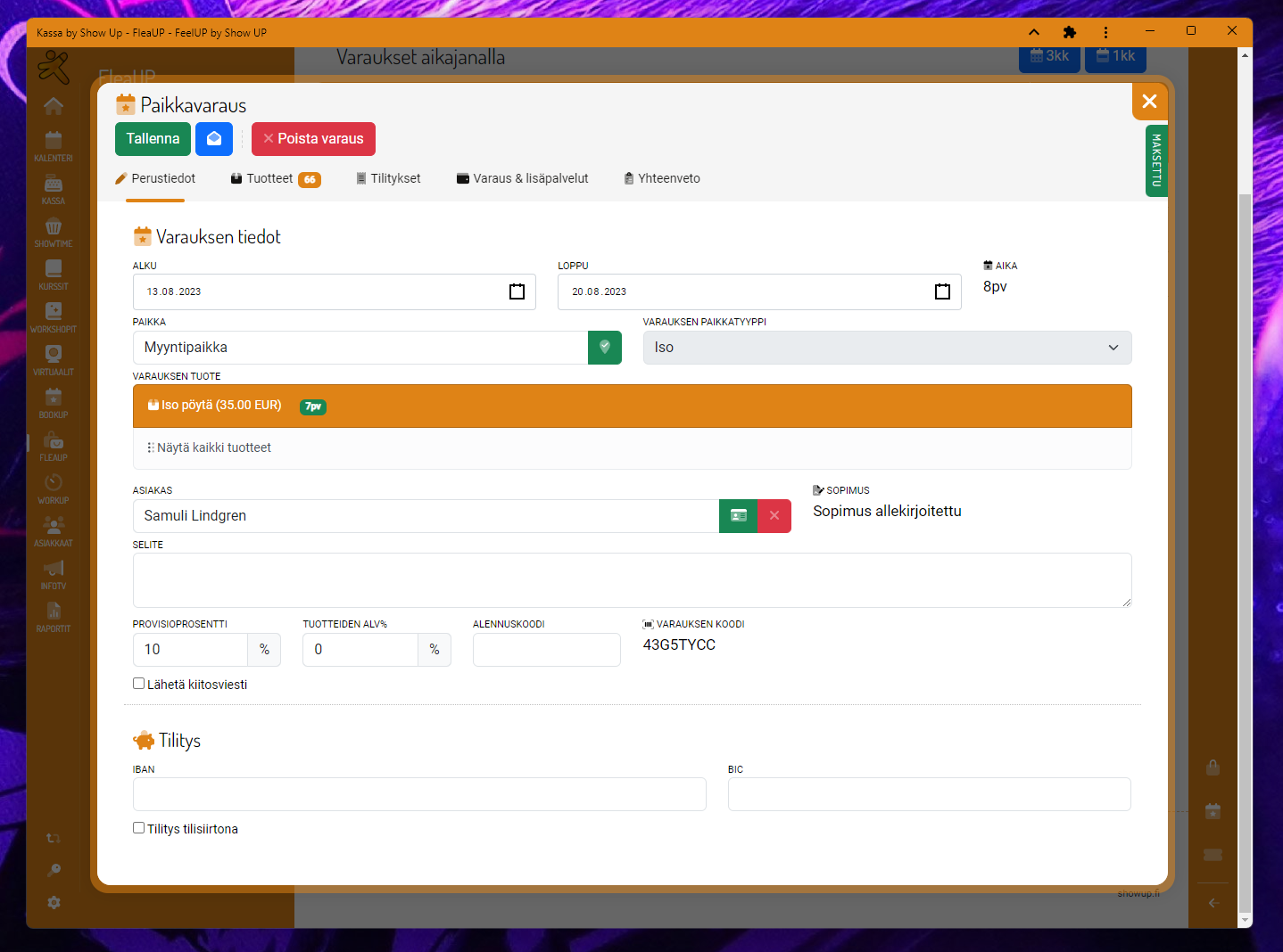 - Jos varaus on merkitty maksetuksi, mutta varauksen piikkituotteissa on olemassa vielä paikkavuokra maksamatta, se kuitataan automaattisesti maksetuksi