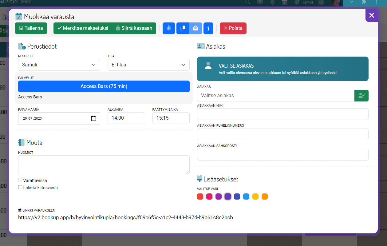 Suurensimme ja toimme selkeämmin näkyville sulje-painikkeen. Voit myös järjestelmäasetuksista ottaa käyttöön uusitun BookUP -varauksen muokkausnäkymän, joka siirtää painikkeet alareunasta yläreunaan.