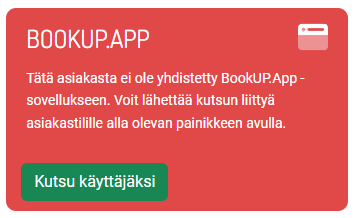 - Voit kutsua asiakkaan BookUP.App -järjestelmän käyttäjäksi, jos käyttäjällä ei ole tunnuksia. Kutsu lähetetään asiakkaalle sähköpostitse, ja seuraamalla ohjeita, hän voi rekisteröityä osaksi omaa BookUP.App -tiliä