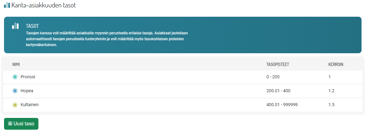 Kanta-asiakastyökalujen avulla voit luoda erilaisia kanta-asiakastasoja, joiden perusteella asiakkaalle kertyy hänen ostojensa perusteella pisteitä. Pisteitä voi kerryttää joko myyntisumman ja kertoimen perusteella tai tuotekohtaisesti määritettävän pistemäärän mukaisesti.