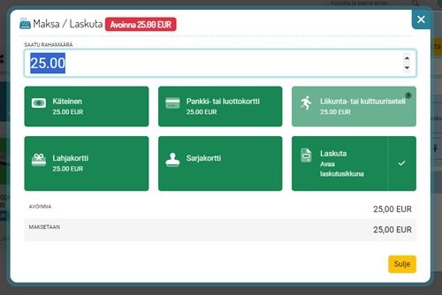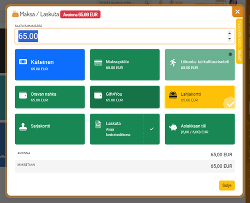 Kun painetaan Maksa / Laskuta, saadaan auki ikkuna, jossa lahjakortti on korostettuna jos lahjakorttikoodi on edelleen voimassa, ja sillä voidaan maksaa.