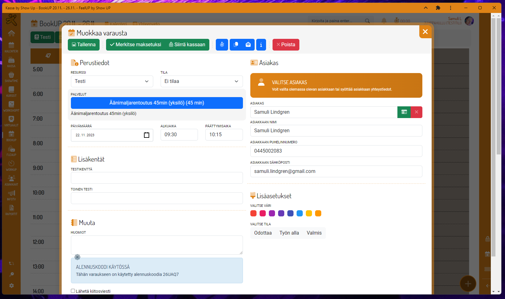 Kuvassa varattu palvelu, jossa on alennuskoodi käytössä.